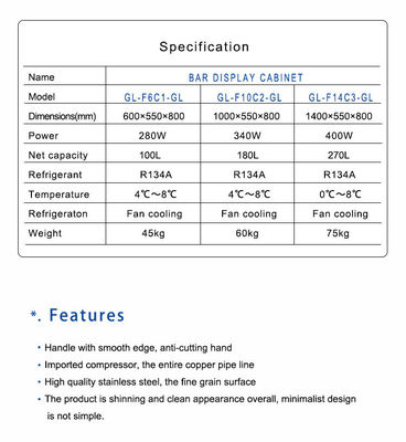 この冷蔵庫はたったの340Wの電力消費で エネルギー効率が高く 費用も安価です4°C~8°C の温度範囲は,あなたの食べ物や飲み物が最適な新鮮性と味のために完璧な温度を維持することを保証します180Lの純容量は,さまざまな物品を保管するのに十分なスペースを提供し,大量の貯蔵を必要とするホテルやレストランにとって理想的な選択肢です.